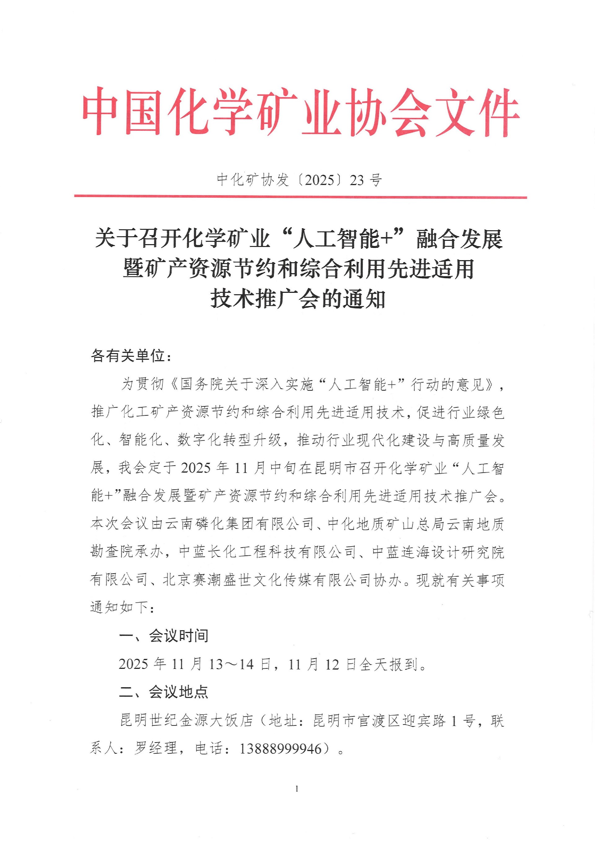关于召开化学矿业“人工智能+”融合发展暨矿产资源节约和综合利用先进适用技术推广会的通知
