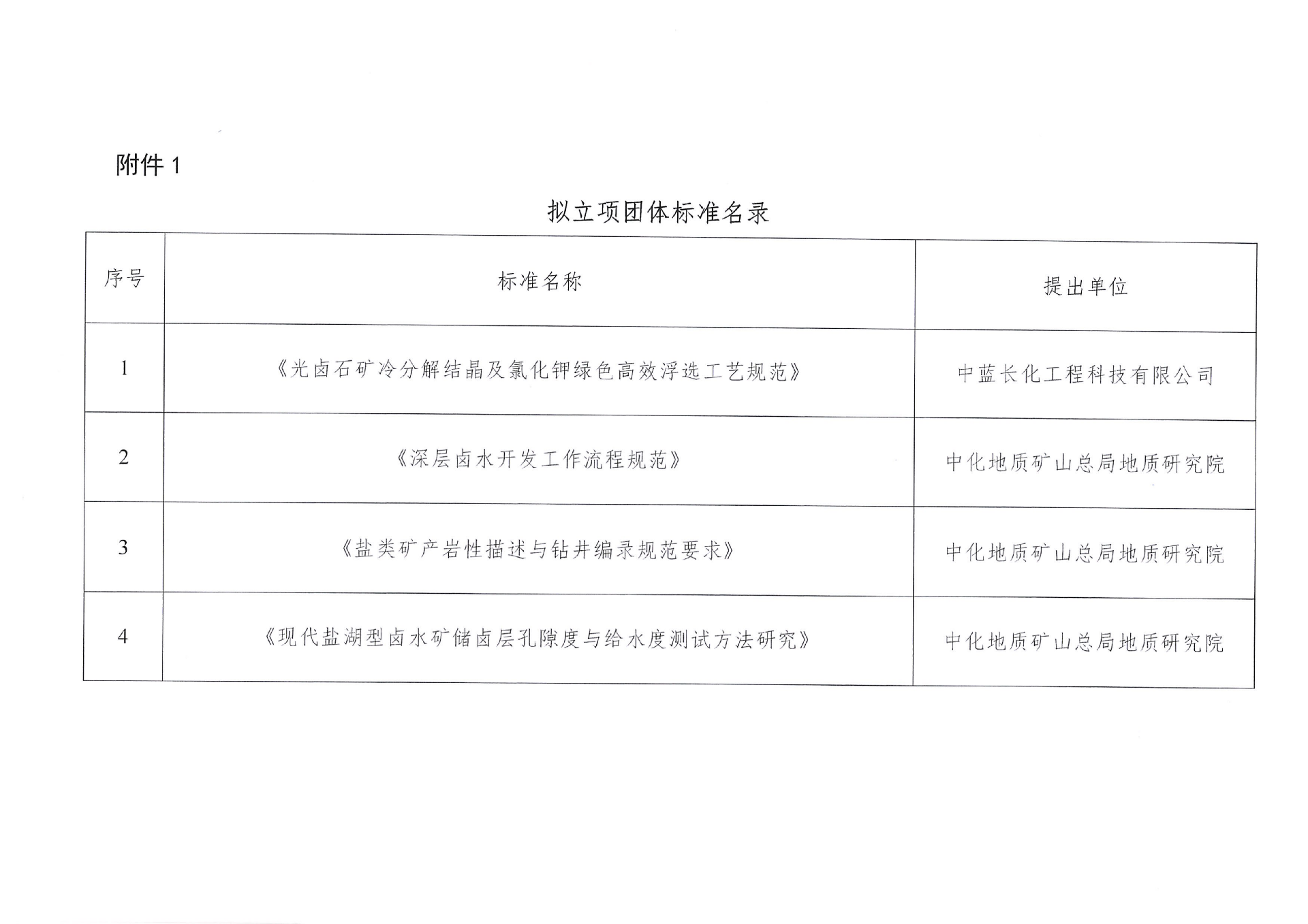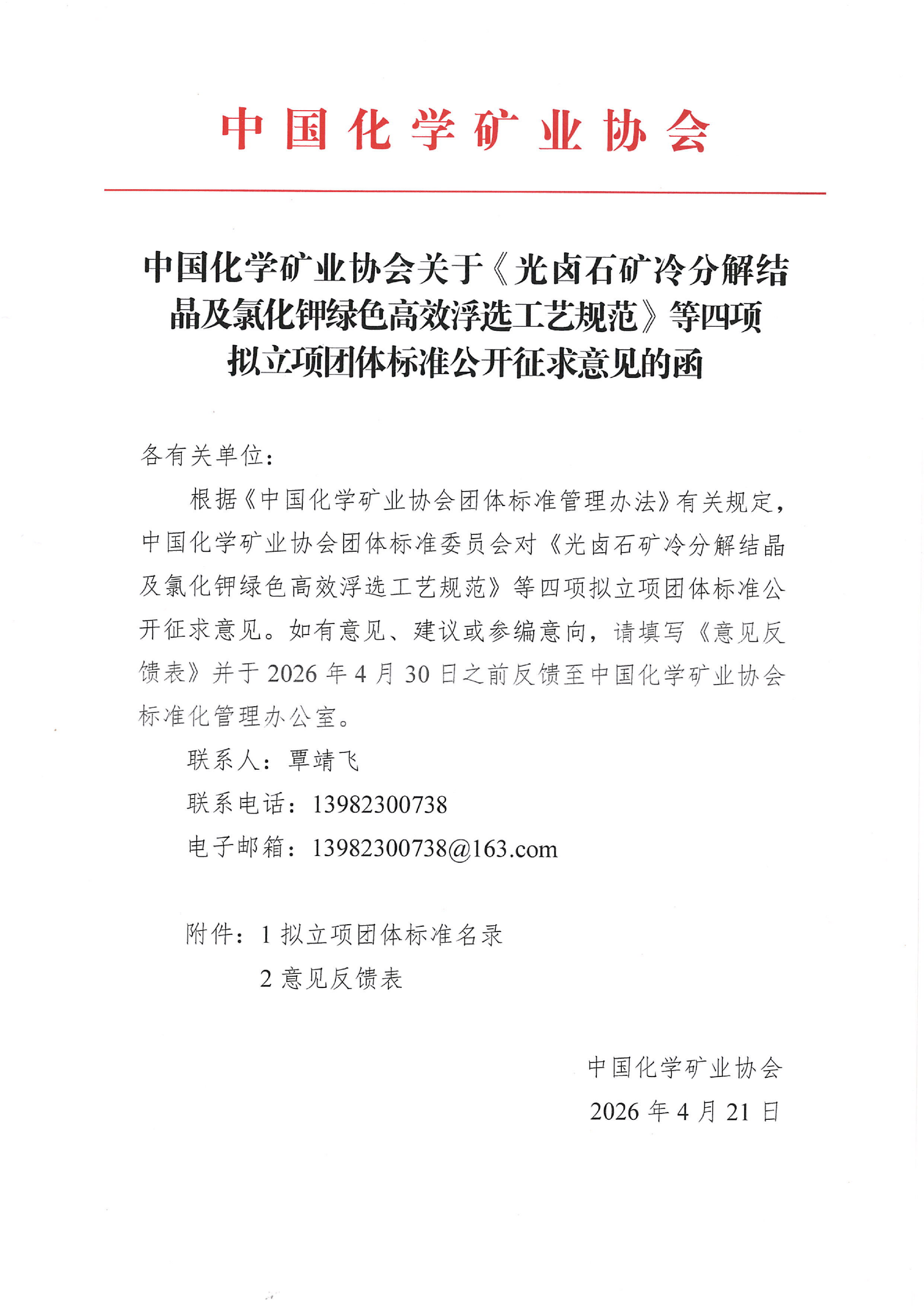 中国化学矿业协会关于《光卤石矿冷分解结晶及氯化钾绿色高效浮选工艺规范》等四项拟立项团体标准公开征求意见的函