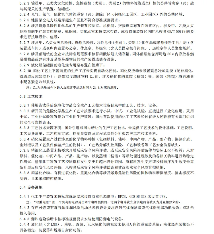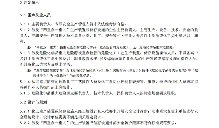 《标准》共分为5个章节,包括范围、规范性引用文件、术语定义、缩略语、判定情形等,核心内容为判定重大隐患的54项情形,涵盖重点从业人员、设计与规划、工艺技术、设备设施、 生产运行、作业安全、安全管理、其他等8个方面。适用于危险化学品生产、经营(有储存)企业,化工及医药企业。