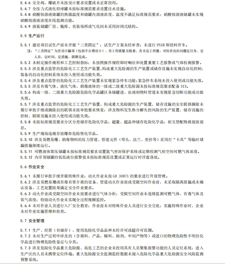 上述负责人表示,《标准》的编制坚持问题导向,围绕重大安全风险防控和重大事故隐患排查治理,聚焦“两重点一重大”、特殊作业等高风险环节以及主要负责人等重点从业人员,以2017年印发的《重大隐患判定标准(试行)》为基础,依据近年来颁布实施的危险化学品安全生产法律法规、标准,借鉴矿山、消防、工贸、港口危险货物作业、特种设备等行业领域重大隐患判定标准而制定。据了解,近年来危险化学品典型事故暴露的突出问题重点包括特殊作业管理、承包商管理、报警管理、违章操作、从业人员资质等“屡查屡犯”问题等。