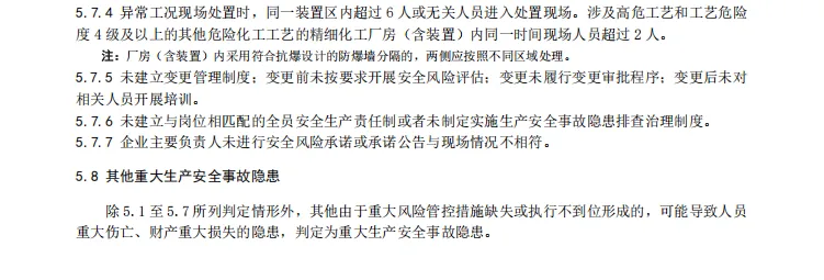 2017年,国家安全生产监督管理总局印发了《化工和危险化学品生产经营单位重大生产安全事故隐患判定标准(试行)》(以下简称《重大隐患判定标准(试行)》),规定了化工和危险化学品生产经营单位重大隐患的20项判定情形。