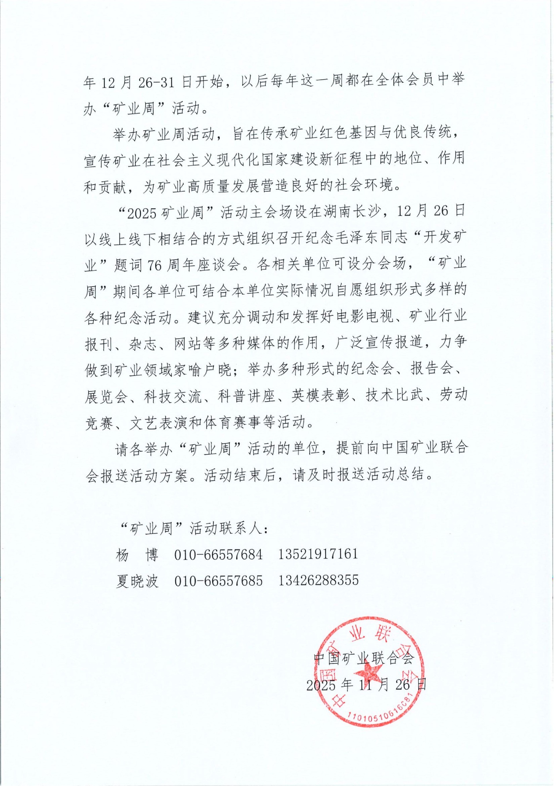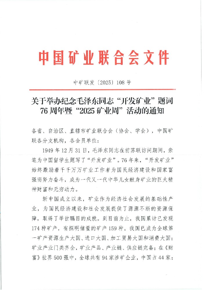 关于举办纪念毛泽东同志“开发矿业”题词76周年暨“2025矿业周”活动的通知