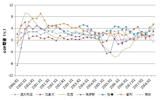 重要矿产资源国中,秘鲁、智利和澳大利亚经济增速加快,加拿大和俄罗斯经济也出现回升,但巴西和南非经济增速下降(图1-2)。