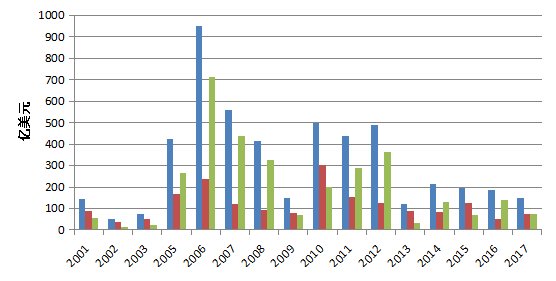 从标普全球财智统计数据看,2006年以来,全球矿业公司并购总体呈现下降趋势,2016年并购已经降至金融危机时的水平,2017年也没有出现大幅回升(图1-9)。