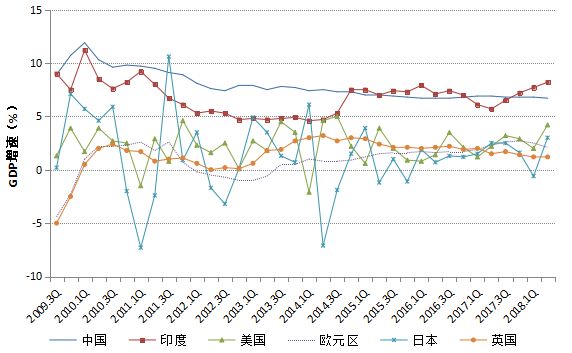 分季度看,美国、日本2018年二季度增速回升至三年来最高,英国则持续回落。印度连续四个季度经济增速回升,并在二季度创2012年以来最高季度增速。中国经济保持较高速度增长,初步实现年初既定目标(图1-1)。