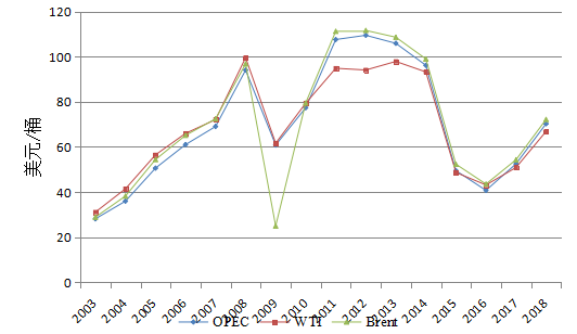 受到需求增长,俄罗斯、伊朗遭到制裁,委内瑞拉、墨西哥产量下降,中东地区冲突等多方面因素的影响,国际油价连续第二个年度上涨。2017年,布伦特原油较2016年上涨17%,收于66.62美元/桶;美国WTI原油价格涨幅超过11%,年底收于60.10美元/桶。与一月份相比,2018年9月份布伦特原油价格上涨了14.5%,欧佩克油价上涨了15.5%,WTI原油价格上涨了10.3%。